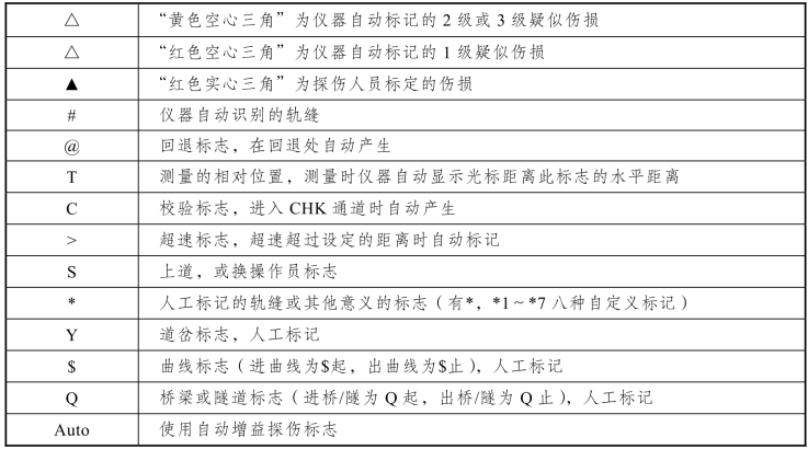 探伤仪内设标记符号说明见表1-0-1。