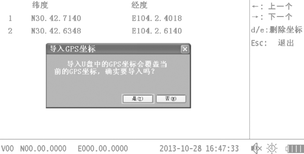 ”键进入GPS引导点列表菜单,仪器会自动弹出“导入GPS坐标”对话框(见图1-4-2),选择“是”然后按确认键即可导入文件中GPS引导点信息。当探伤仪到达GPS引导点20 m范围内时仪器显示“已到达GPS引导点附近!”,当到达10 m范围内时,仪器会显示“接近GPS引导点!”。仪器一次可以最多输入20个引导点。