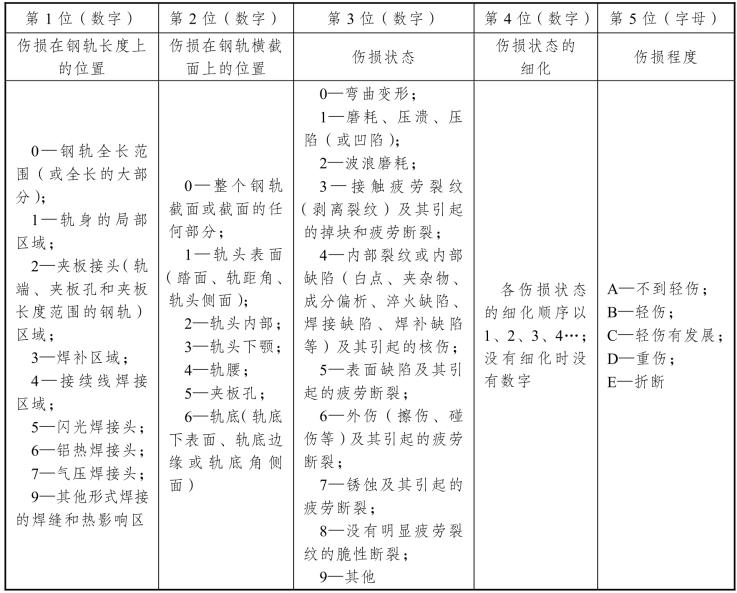 伤损编码按照《钢轨伤损分类》(TB/T 1778—2010)进行编码,见表1-4-2。