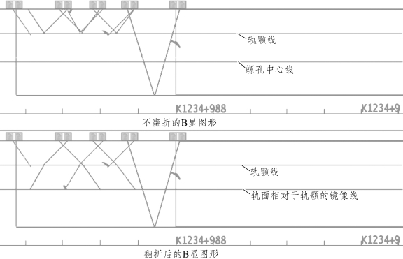 ”键可以使4个斜70°的B显相对于轨颚线翻折,这样便于区分斜70°一二次波图形,如图1-4-1所示为翻折前后的B显图形。