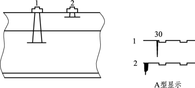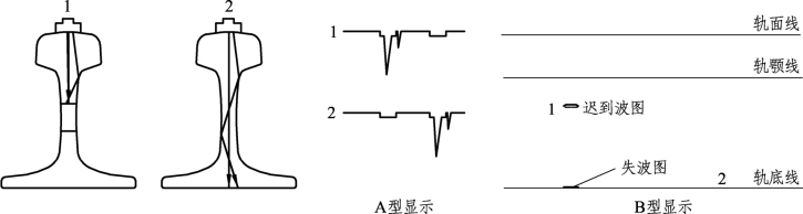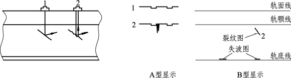 图1-6-8 钢轨横向斜裂纹与A显、B显回波