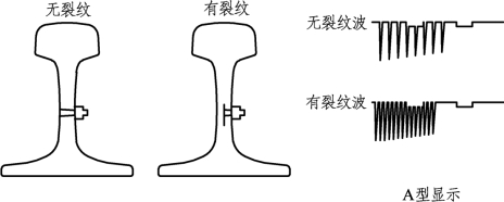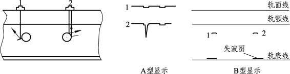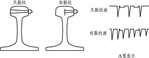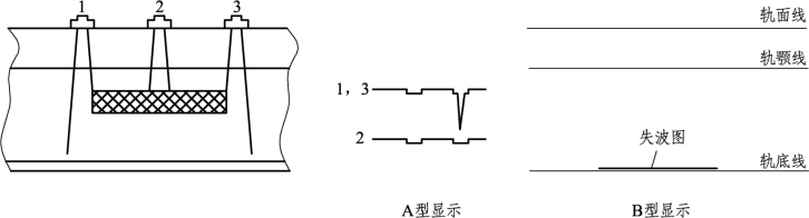失波报警法。0°探头置于轨面,在正常探伤灵敏度下,可根据0°探头失波报警时的探头位移长度(A型显示)或失波图形长度(B型显示)确定(见图1-6-15)。一般为报警时探头位移距离就是纵向裂纹的长度,但由于现场裂纹实际状态和仪器探伤灵敏度调节的影响,测出长度与实际裂纹长度会有一些误差。