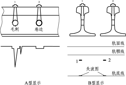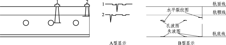① 遇有钢轨轨腰单侧水平裂纹、轨头部一侧或颚部圆弧处有水平裂纹,裂纹进入声束扫查范围,A型显示的荧光屏对应基线会同时显示底波和水平裂纹回波;B型显示根据裂纹距轨面高度,分别显示在轨面线下方的对应位置上,如图1-6-6所示。