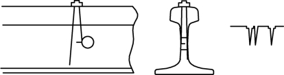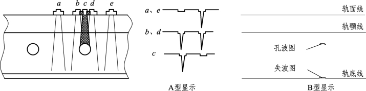 ② 螺孔单侧水平裂纹,A型显示的荧光屏对应基线有时会出现螺孔波、水平裂纹波和轨底波3波并存的现象;B型显示与螺孔水平裂纹相同。当出现这种显示,应将探头横向移动,观察伤波变化情况,确定单侧裂纹的具体部位,由于单侧裂纹的横向深度不一或探头位置偏离轨面中心轴线等因素,有可能发生裂纹漏检,因而要经常注意探头位置的调整,如图1-6-7所示。