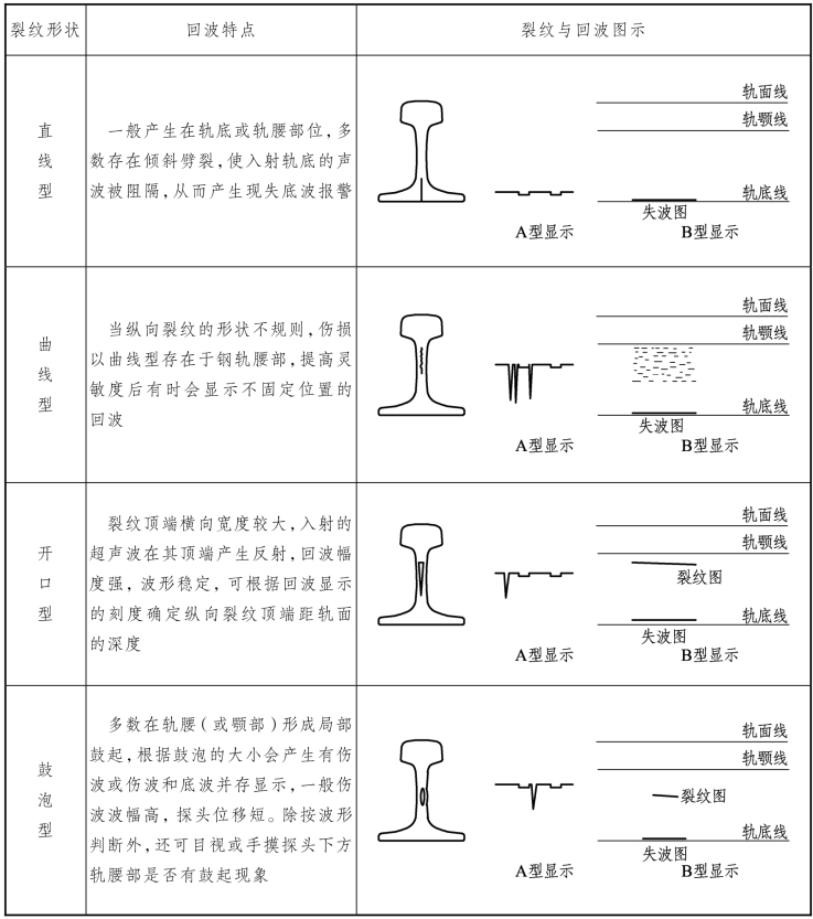 纵向裂纹的长度不一,从几厘米至十几米,甚至纵贯整根钢轨。轨头、轨腰、轨底部位都有可能存在。在钢轨外观状态正常的条件下,0°探头探测中发生失底波或底波减弱报警,为避免因轨底(腰)严重锈蚀的干扰,一般应适当开大增益,观察底波有否显示。若有底波显示,可以不判伤;如果仍无底波显示,或在荧光屏扫描线上有回波显示,可初步判为纵向裂纹。各种纵向裂纹回波特点见表1-6-1。