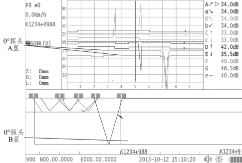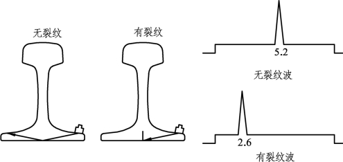 轨腰纵向裂纹,可参照上述方法判断(见图1-6-13),由于轨腰宽度窄,等分波间隔小,应注意分辨。