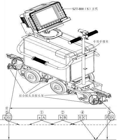 探伤仪上的0°探头如图1-6-1所示,其中G为前0°探头,F为后0°探头。对应的0°探头 的A显基线如图1-6-2所示,其中前0°基线为图中所指上方相应线条,后0°探头为图中所指下方相应线条。0°探头的B显基线如图1-6-2中所指相应线条。