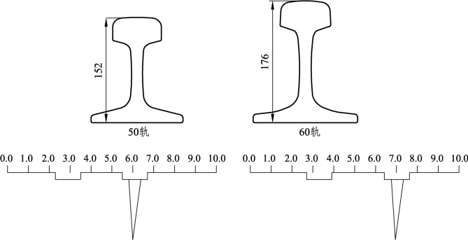 钢轨大小腰处,因无螺栓孔,因此正常情况下探头发射超声波由轨头直达轨底,回波深度与钢轨高度有关。A型显示的荧光屏对应基线刻度(声程1∶2.5)50 kg/m轨在6.0左右、60 kg/m轨7.0左右,如图1-6-3所示。