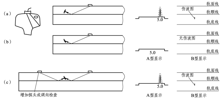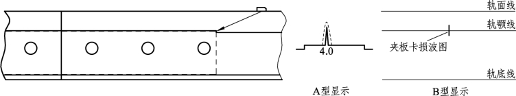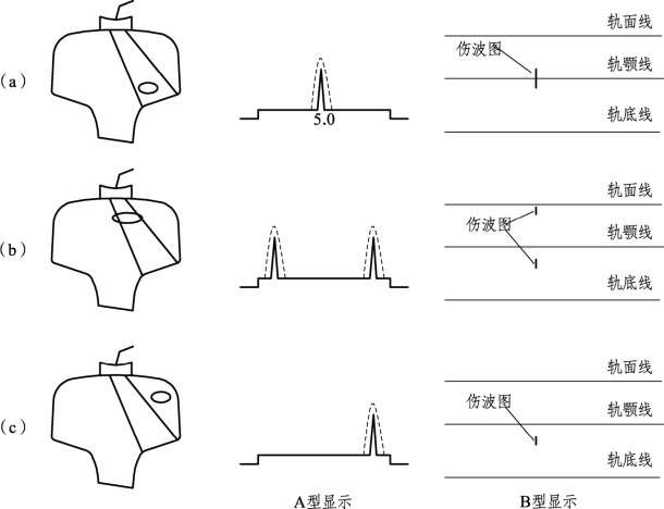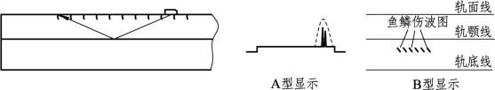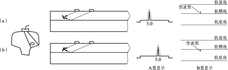 ② 核伤位于轨头上方。一、二次波扫查区,A型显示回波在荧光屏扫描线上分两次显示,两次显示越靠近扫描线两端,则核伤距轨面越近[见图1-8-6(b)];B型显示在轨面线附近和离轨颚线较远的下方。