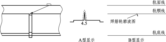 钢轨焊缝,轨头下颚都存在一个凸起的焊筋,探伤中一般都会产生回波。焊筋轮廓波在荧光屏刻度4.5左右显示,由于焊筋几何形状不一,回波显示的位移和强弱略有差异,铝焊接头回波强,气焊接头回波弱,如图1-8-15所示。要注意位移长、波幅强的回波分析,防止焊缝内缺陷的漏检。