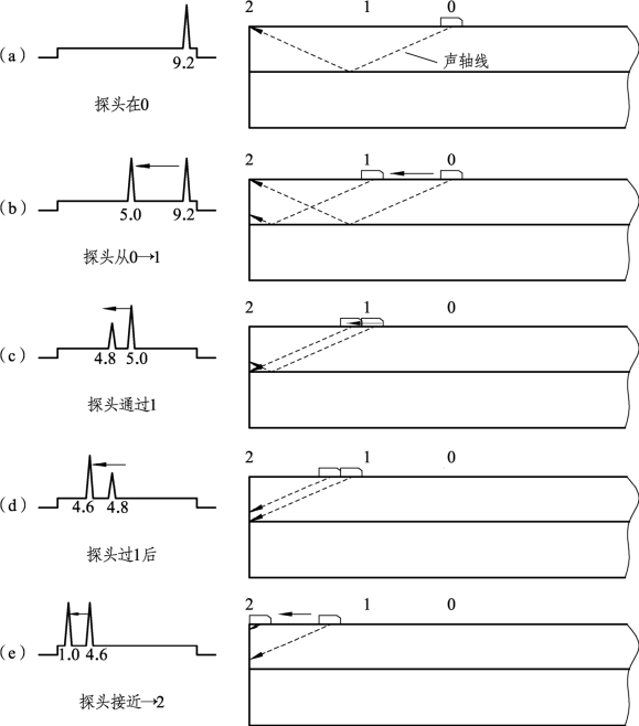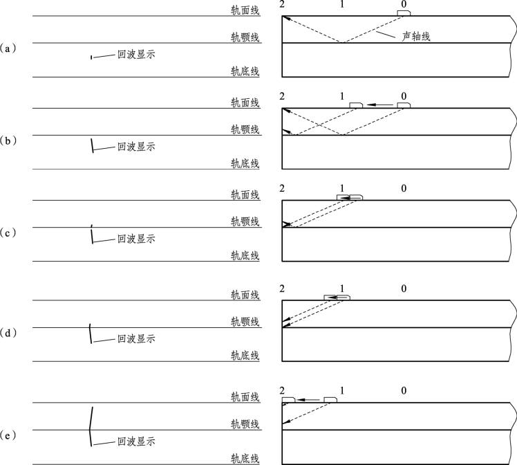当70°探头入射点距轨端(60 kg/m轨)216 mm左右[见图1-8-3(a),50 kg/m轨为 208 mm左右],荧光屏刻度9.2左右(仪器标定为横波声程1∶2.5),将显示轨端顶角反射波;随着探头向轨端移动,由位置0移至位置1,回波由刻度9.2向5.0移动[见图1-8-3(b)],这时二次波由轨端顶角向轨颚方向移动,同时,在荧光屏刻度4.8处显示轨颚底角波[见图1-8-3(c)],探头位置距端轨108 mm左右,继续前移,二次回波波幅下降,一次回波波幅上升[见图1-8-3(d)],并随着探头从位置1移向位置2,一次回波由刻度4.6向1.0处移动[见图1-8-3(e)]。