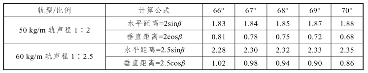 ②核伤中心在钢轨纵向的位置的确定。核伤反射波中心刻度乘以水平距离系数,即为相关探头至核伤中心位置水平和垂直距离系数,见表1-8-1。
