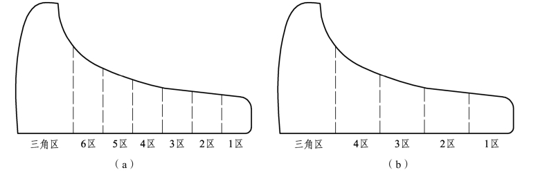 轨底扫查方式:通常我们把轨底分为4个区域(从轨底角向轨底中心每隔13 mm为1个区,从轨底角向轨底中心依次为1、2、3、4区),见图2-7-3(b);部分教材把轨底分为6个区域,见图2-7-3(a),共扫查5次,第1次扫查区域为轨底1区,从焊缝轨底1区,向轨角偏10°呈锯齿状纵向后退扫查,扫查范围大于等于200 mm;第2次扫查区域同样在轨底1区,完成第1次扫查后回正探头,从远端向焊缝中心呈锯齿状纵向平行前进扫查;第3次扫查区域为轨底2区,完成轨底1区扫查后平移探头至轨底2区,从焊缝中心后退呈锯齿状纵向平行扫查,扫查距离大于等于200 mm;第4次扫查区域为轨底3区,完成轨底2区扫查后将探头平移至轨底3区,从远端向焊缝中心呈锯齿状纵向平行前进扫查;第5次扫查为轨底4区,完成轨底3区扫查后平移探头至轨底4区,从焊缝中心后退呈锯齿状纵向平行扫查,扫查距离大于等于200 mm。上述过程结束后,由一端向另一端重复上述步骤,直至扫查完内外两侧完成轨底全面探伤。
