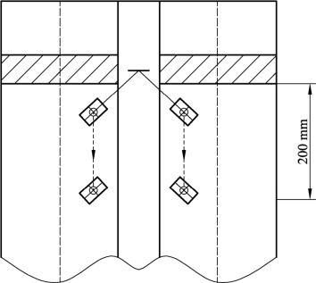 轨底三角区扫查方式:轨底三角区探伤一般采用双探头分3次扫查,第1次扫查从轨底圆弧区域焊缝中心,两探头与轨底板呈60°夹角同时呈锯齿状匀速后退扫查,扫查距离大于等于200 mm;第2次扫查同样在轨底圆弧区域,内侧探头抵住焊缝中心不动,外侧探头呈锯齿状匀速后退扫查,扫查范围大于等于200 mm;第3次扫查还是在轨底圆弧区域,外侧探头抵住焊缝中心不动,内侧探头呈锯齿状匀速后退扫查,扫查范围大于等于200 mm。上述过程结束后,由一端向另一端重复上述步骤,直至完成轨底圆弧区域全面探伤,如图2-7-5所示。