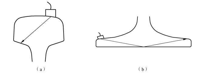 单K2.5探头现场灵敏度调试方法(探测轨头、轨脚范围内φ3横孔当量缺陷):将探头横向置于轨脚上[见图2-7-1(b)],找出对边轨脚边最高回波波高调至80%,增益20 dB;或将探头横向置于轨头轨面,探测轨头棱角[见图2-7-1(a)],棱角最高回波波高调至80%,增益18 dB后作为K2.5探测轨头/轨底的探伤灵敏度。