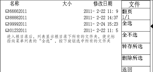 仪器可以将SD卡或NANDFLASH中所有文件夹一起导出,也可以将某些选中的文件导出。以导出根目录下所有的文件夹为例,先将U盘插入仪器的USB接口,然后按下