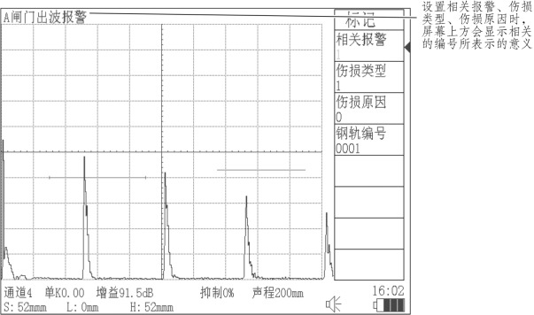 键,进入伤损标记菜单,设置好相关报警、伤损类型、伤损原因、钢轨编号,然后再按
