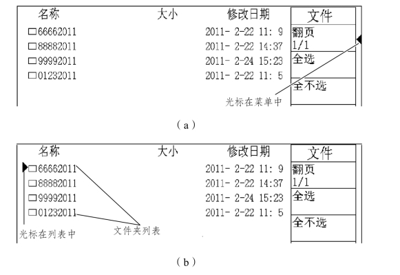 在介绍文件的删除和导出前介绍光标在列表和菜单键之间切换、进入文件夹、选中文件夹或文件3个操作。