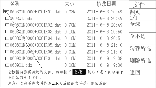 播放完毕后,如果要回到文件列表查看文件,这时可以使光标指向回放菜单的“返回”项,按下旋钮即可返回到文件列表,此时屏幕显示文件列表。