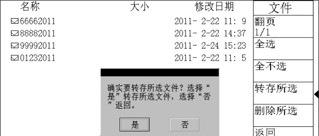 再移动光标指向“转存所选”,然后按下旋钮,将会弹出一个对话框询问您是否要转存所选文件,旋转旋钮选中“是”,如图2-8-8所示。