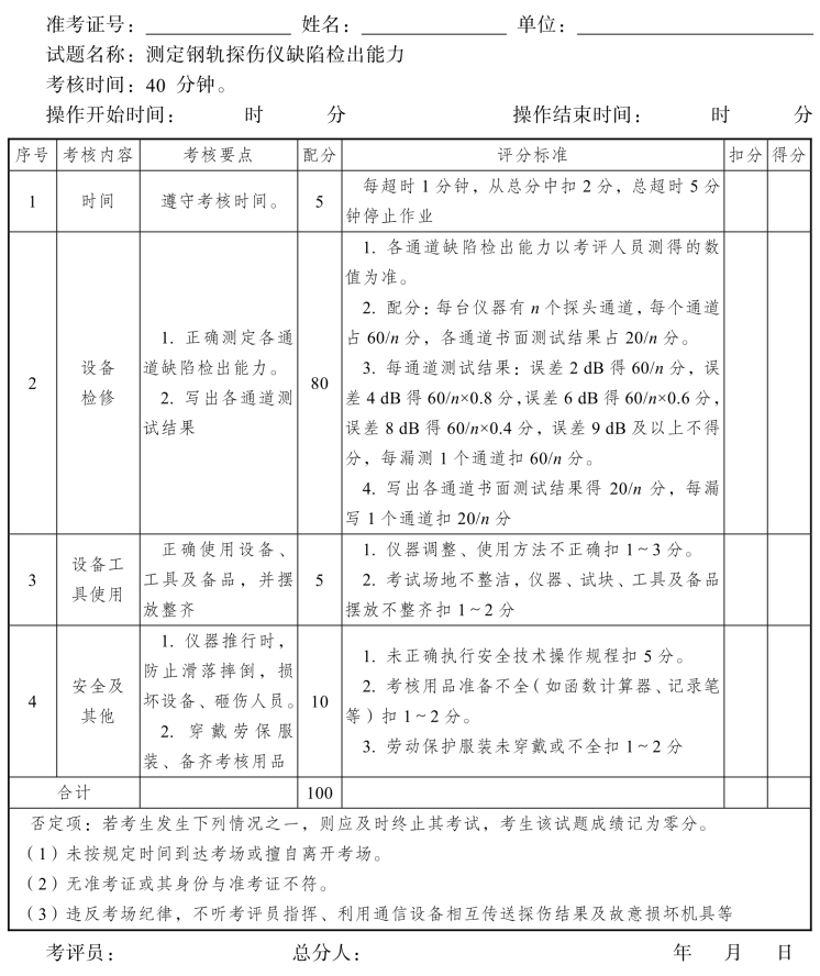 2.评分要点:探伤方法正确,数据记录清楚,伤损判定准确。
