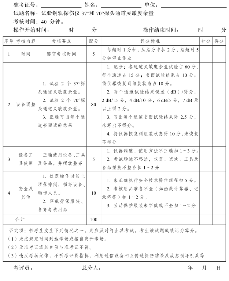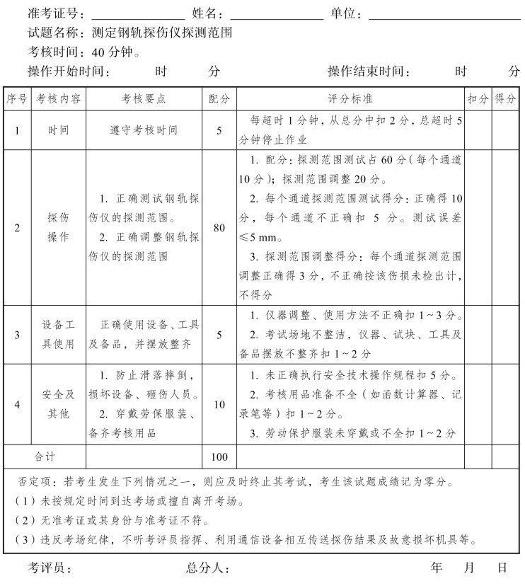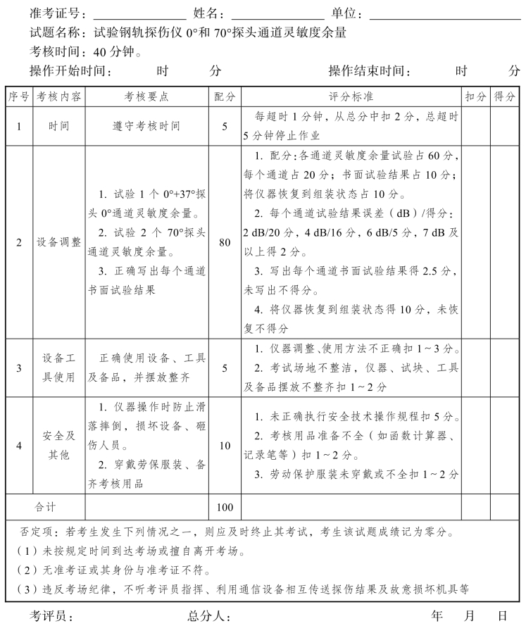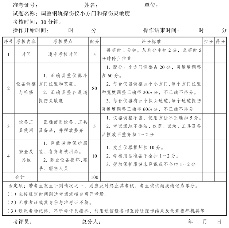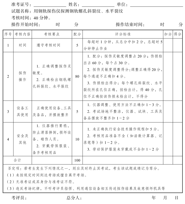 钢轨探伤工初级工操作技能考核评分记录表(5)
