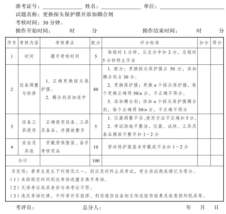 2.评分要点:保护膜更换方法正确、耦合剂添加适中。