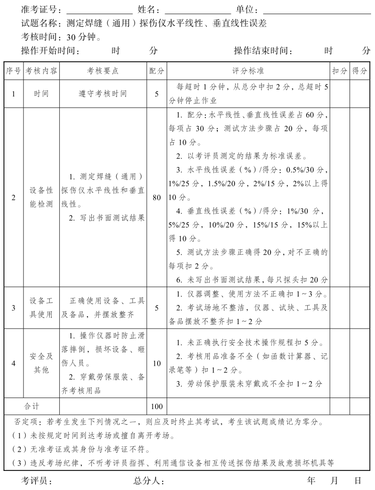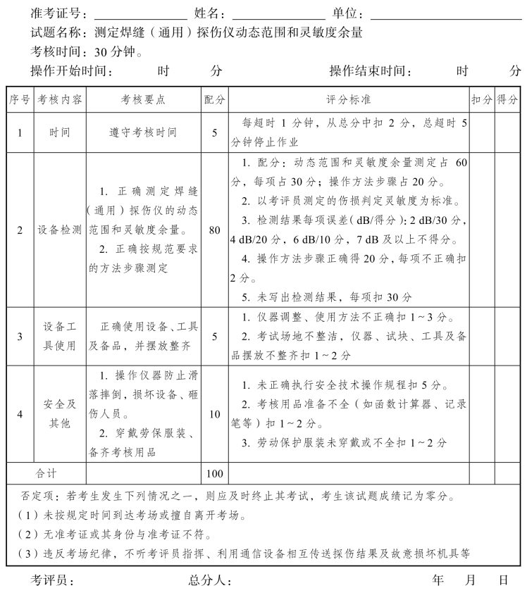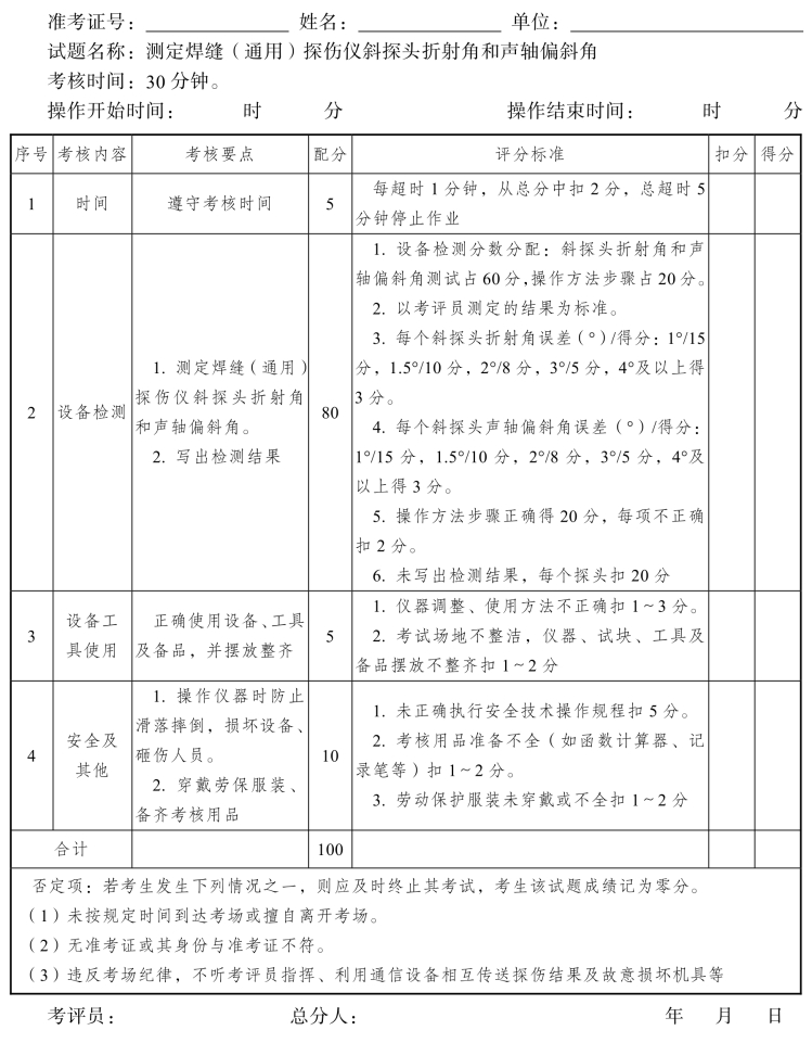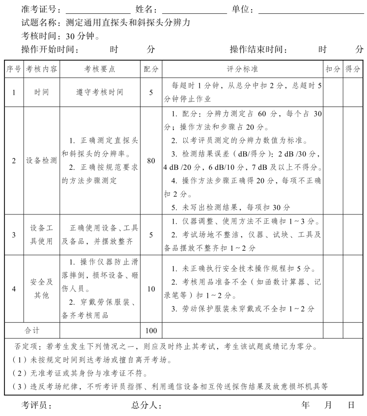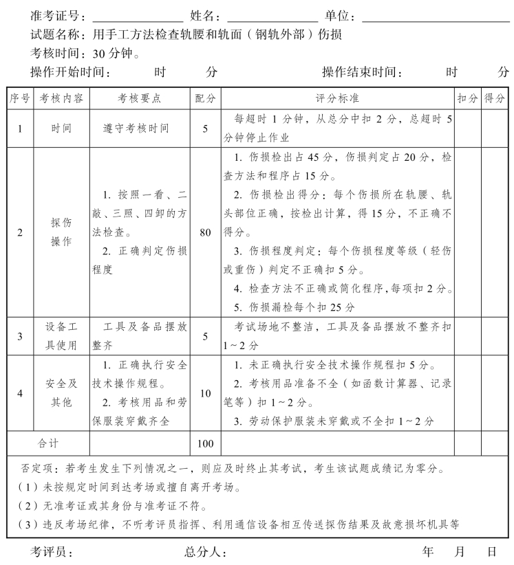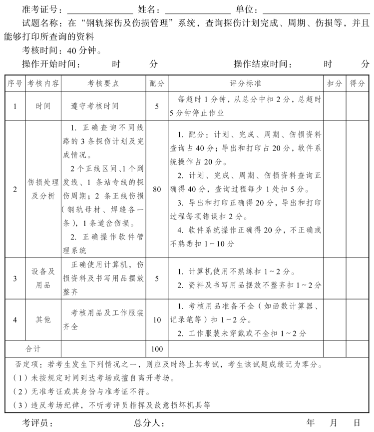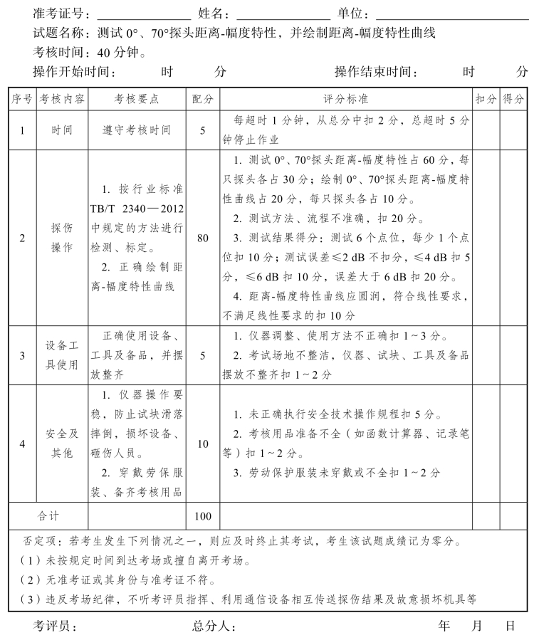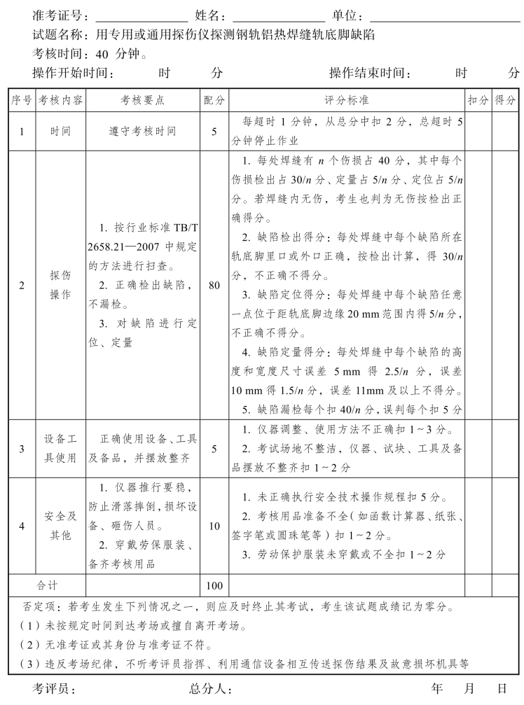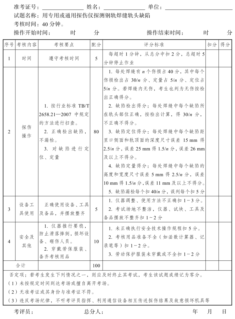 2.评分要点:探伤方法正确,数据记录清楚,伤损判定准确。