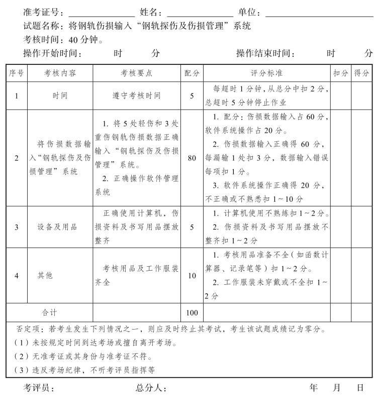 钢轨探伤工高级工操作技能考核评分记录表(10)