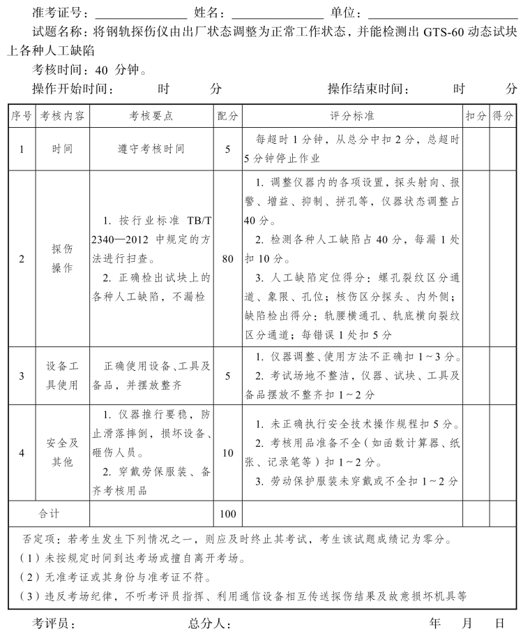 钢轨探伤工高级工操作技能考核评分记录表(12)