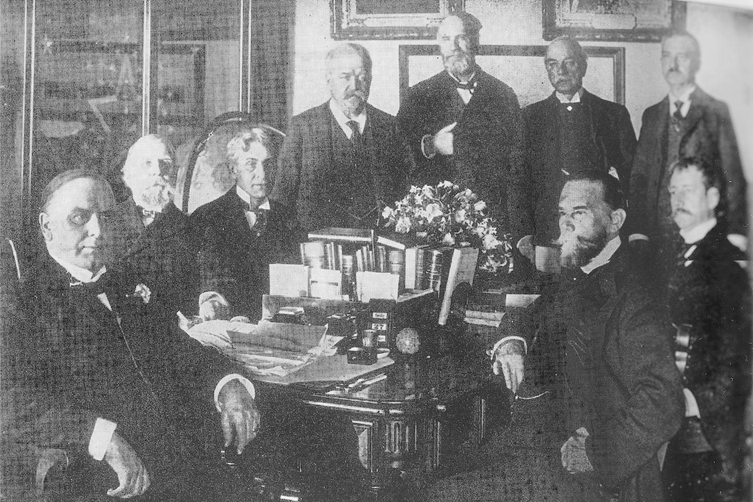 1898年麦金莱政府内阁合影。前排右一为罗脱,右二为海约翰