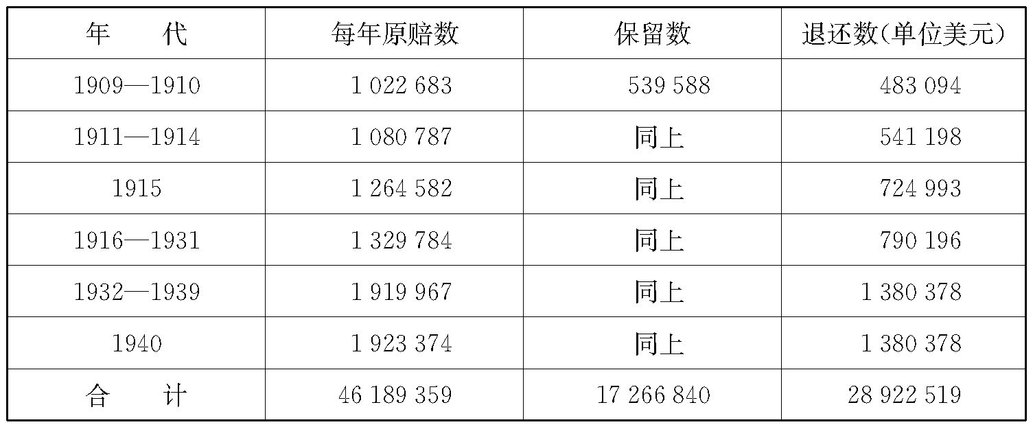 根据1901年的《辛丑条约》,列强各国共向中国勒索赔款4.5亿两白银,分39年还清,加上年息4厘,本利共计9.82亿两。此外,还有地方赔款2000万两,总数超过10亿两,史称“庚子赔款”。美国从中分得3293.9055万两,合24440778.81美元,占全部的7.4%强。年息4厘,到1940年止,中国共应向美国支付本利共计53551551.15美元。美国人心里很清楚,这笔款项大大高出了美国在义和团运动中商民的损失以及美国的军费,所以海约翰一度有将赔款额缩减一半的想法。据驻美公使梁诚估计,赔款额比实际损失高出了2200万美元。清政府一再向美方提出此事。(60)交涉了数年,到1905年美国政府内部对退款意见已基本统一。但时值日俄战争,美国外交关注点转移,退款交涉受到影响。梁诚继续四处奔走,积极活动,推动美早日退款。