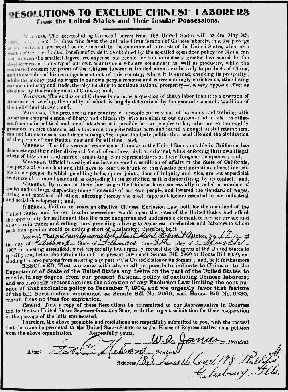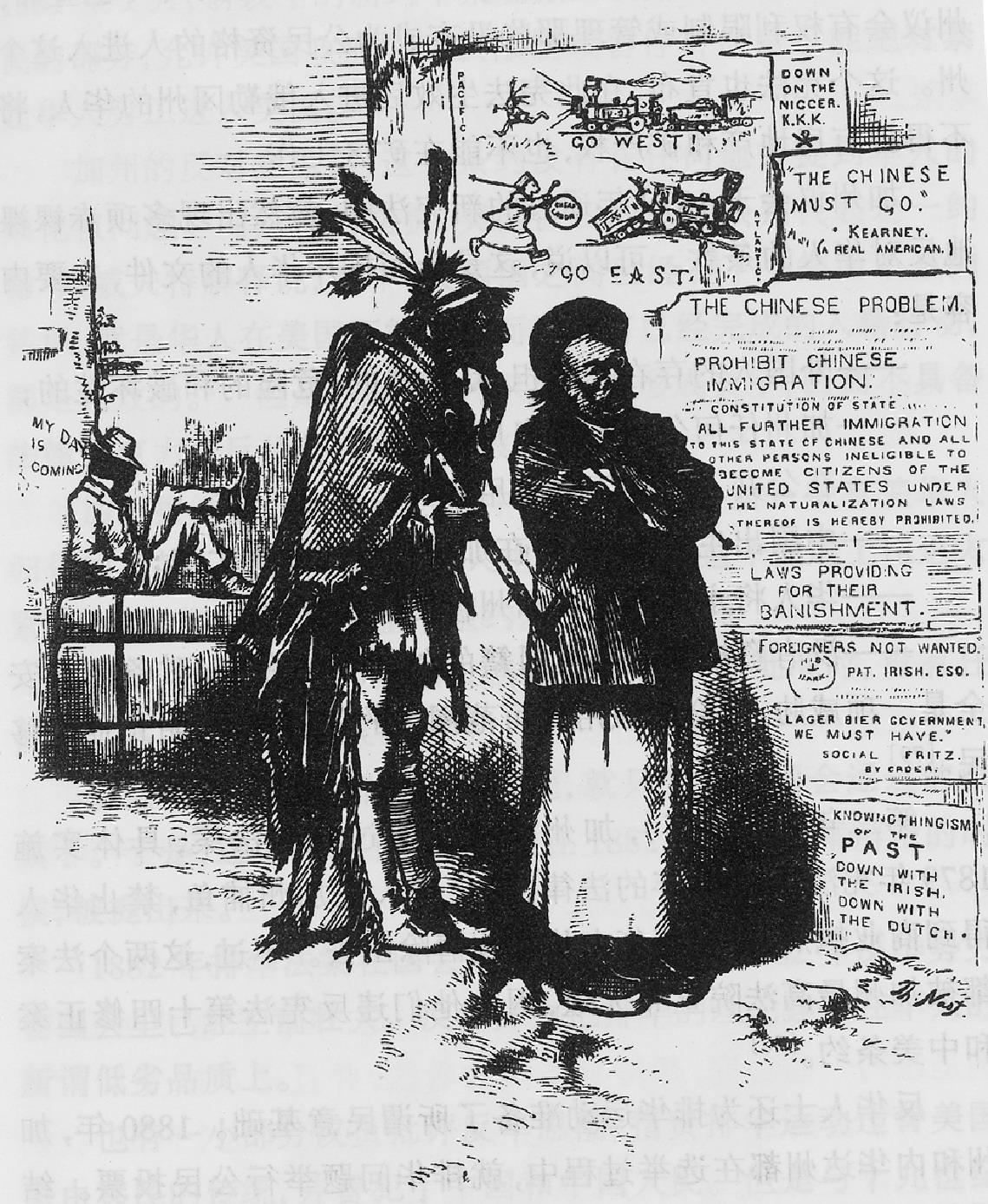 种族主义势力为了转移本国工人的不满,把工人失业和居民生活水平下降归咎于外来移民,特别是中国移民。他们进行蛊惑宣传,反华成了不少报刊的主题。《纽约时报》甚至危言耸听地警告说,西部各州正在变为“中国的殖民地”。外来的白种工人有的加入了美国籍,有的与美国工人一道进行劳工运动,中国工人因为种族、语言的隔阂,难以与美国工人打成一片;又因为祖国贫弱,组织涣散,难以成为一支统一的力量,保护自己的利益。白人种族主义者拣软的欺,对华工进行迫害。爱尔兰人加尼纠集一些落后工人,于1877年8月组成加利福尼亚工人党,又称“沙滩党”,以鼓吹排华为宗旨,叫嚷:“白人男女……决不能和哪怕一个中国苦力,像同胞一样在一起生活”,要“以最大的速度并尽我们的一切力量,全部清除国内廉价的中国劳动力”。他们到处对华人进行敲诈和迫害。与此同时,“反华俱乐部”、“人民保护同盟”、“拯救同盟”等五花八门的排华组织也在西海岸应运而生。(18)1876年到1877年,国会派出一个专门委员会调查加州华人问题。委员会的报告对华人肆意诽谤。据统计,当时旧金山全市人口29万余人,其中1/4为华人,共7万余人。因此国会认为加州白人有被华人压倒的危险,要求政府与中国改订移民条约,限制华人入境。