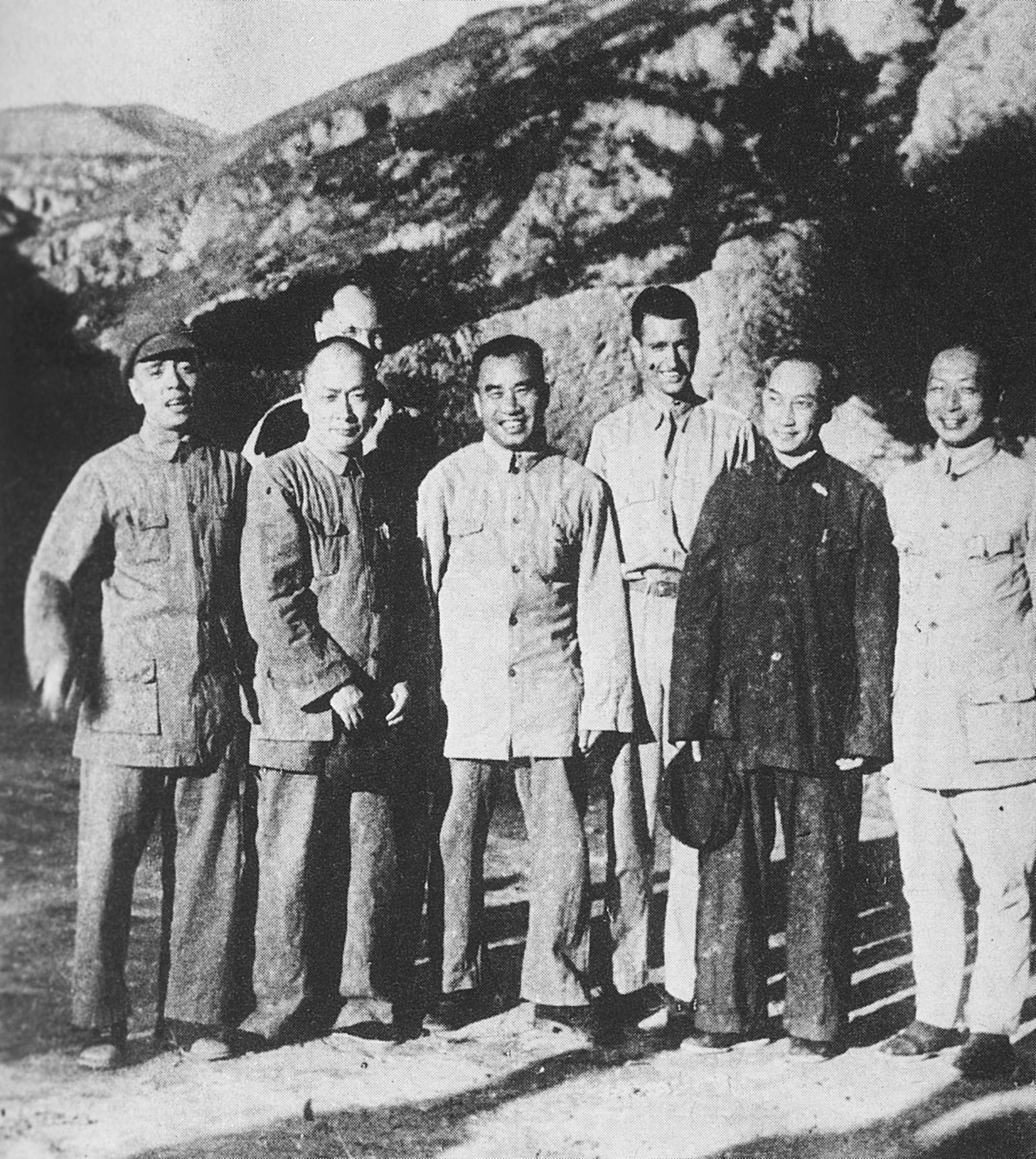 谢伟思与中共四川籍领导人。前排左起:杨尚昆、陈毅、朱德、谢伟思、吴玉章、聂荣臻