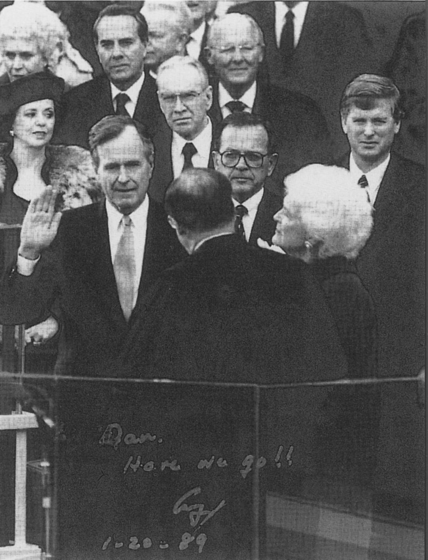 1988年,布什赢得美国大选。12月22日,圣诞节前夕, 布什一家祖孙三代共18人到韩叙大使官邸作客。官邸里花团锦簇,温暖如春。美国待任总统到一个国家的大使馆过圣诞节是前所未有的,这无疑是一种特别的友好表示。双方共叙友情,气氛十分融洽、亲切和热烈。1989年2月16日,布什总统就国际形势、地区冲突和中美关系书面回答新华社记者的问题。他回顾了从他卸任美国驻华联络处主任以来13年中美关系方方面面的发展,对两国关系的未来发展充满了信心。讲到台湾问题时,他说:“美国政府意识到,对中国政府和中国人民来说,台湾是一个重要问题。我们高兴地看到,台湾海峡两岸不断增长的贸易和旅行的机会对紧张气氛的缓和作出了贡献,希望这种倾向将继续下去。美国政府承诺遵守1972年、1979年和1982年的三个公报,它们为今后我们两国关系的发展奠定了坚实的基础。”(18)