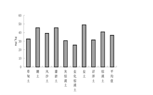 对瓜州县不同土壤类型碱解氮含量进行对比分析,盐化棕漠土碱解氮含量最高,为48.95mg/kg。盐土碱解氮含量最低,为25.34mg/kg。(见图4-8)