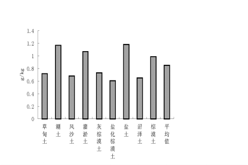 对瓜州县不同土壤类型全氮含量进行对比分析得出。盐土全氮含量最高,为1.18g/kg。盐化棕漠土全氮含量最低,为0.61g/kg。(见图3-6)