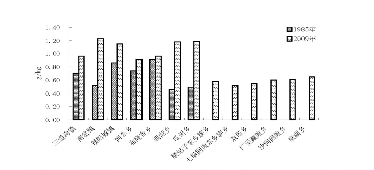将此次测土配方施肥所测全氮含量数据与第二次土壤普查全氮含量数据相比较,由于腰站子东乡族乡、七墩回族东乡族乡、双塔乡、广至藏族乡、沙河回族乡、梁湖乡为第二次土壤普查之后所建制的移民乡镇,没有第二次土壤普查的数据,无法做出比较,只比较三道沟镇、南岔镇、锁阳城镇、河东乡、布隆吉乡、西湖乡、瓜州乡7个乡镇。通过比较7个乡镇全氮含量的变化状况,结果表明:7乡镇的土壤全氮含量均有所增加,平均增加了0.42g/kg;其中西湖乡、南岔乡及瓜州乡增幅较大,分别增加0.73g/kg、0.71g/kg和0.70g/kg;其他乡镇增幅相对较小,均小于0.30g/kg。(见图3-5)