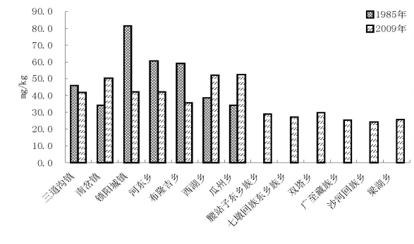将此次测土配方施肥所测碱解氮含量数据与第二次土壤普查碱解氮含量数据相比较,由于腰站子东乡族乡、七墩回族东乡族乡、双塔乡、广至藏族乡、沙河回族乡、梁湖乡为第二次土壤普查之后所建制的移民乡镇,没有第二次土壤普查的数据,无法做出比较,只比较三道沟镇、南岔镇、锁阳城镇、河东乡、布隆吉乡、西湖乡、瓜州乡7个乡镇。通过比较7个乡镇有碱解氮含量的变化状况,结果表明:全县碱解氮含量减少5.34g/kg;其中7乡镇中有三道沟镇、锁阳城镇、河东乡和布隆吉乡4个乡镇的土壤碱解氮含量减少,锁阳城镇减幅最大,为39.22mg/kg;西湖乡、南岔镇及瓜州乡碱解氮含量增加,分别增加了13.50mg/kg、16.20mg/kg和18.33mg/kg;其他乡镇碱解氮含量变化相对较小。(见图3-7)