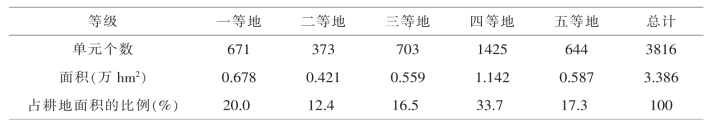 瓜州县总耕地面积为3.386万hm2,其中一等地、四等地和五等地占的比例较大,分别为20.0%、33.7%和17.3%,占总耕地的71.0%;二等地和三等地占的比例较小,分别为12.4%和16.5%。见表5-1与图5-1。