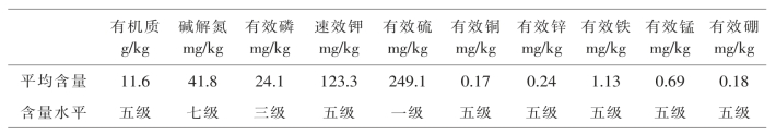 一等地灌溉保证率高,灌溉水质好,地势平坦,无明显障碍层,盐分含量低,土壤理化性状良好,可耕性强,土壤肥力相对较高。耕层土壤养分含量有机质11.6g/kg,碱解氮41.8mg/kg,有效磷24.1mg/kg,速效钾123.3mg/kg,有效硫249.1mg/kg,有效铜0.17mg/kg,有效锌0.24mg/kg,有效铁1.13mg/kg,有效锰0.18mg/kg。(见表5-4)