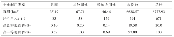 一等地,综合评价指数IFI大于0.6915,耕地面积0.68万hm2,占总耕地面积的20.0%。评价单元671个,其中水浇地6628.57hm2,占一等地面积的97.8%;果园35.19hm2,占一等地面积的0.52%;其他园地67.71hm2,占一等地面积的1.00%;设施农用地46.46hm2,占一等地面积的0.69%。(见表5-3)