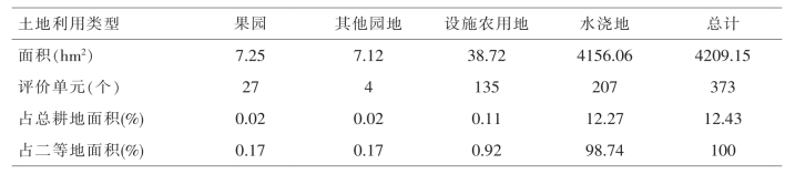 二等地,综合评价指数IFI0.6915~0.6830,耕地面积0.43万hm2,占总耕地面积的12.4%,评价单元373个。其中水浇地4156.06hm2,占二等地面积的98.74%;设施农用地38.72hm2,占二等地面积的0.92%;其他园地7.12hm2,占二等地面积的0.17%;果园7.25hm2,占二等地面积的0.17%。(见表5-5)
