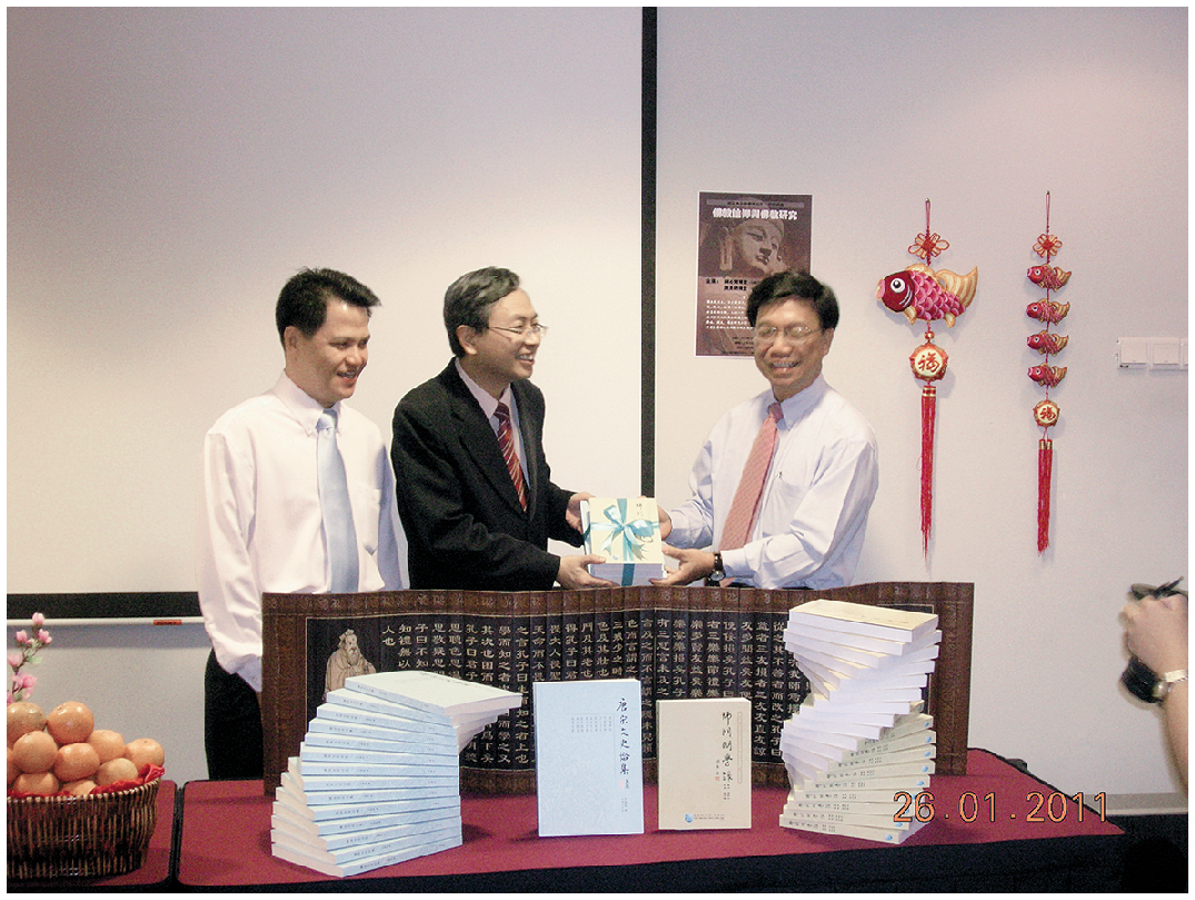余历雄(左)在马来西亚“拉曼大学中华研究院新书推介礼”上