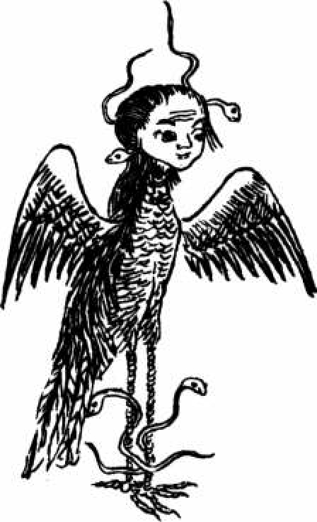 在东海的海岛上,有一位神人,长着人一样的面孔和鸟一样的身体,左右耳朵里分别贯穿着两条黄蛇,脚下也分别踩着两条黄蛇,他的名字叫作禺。黄帝生了禺,禺生了禺京。禺京身处北海,禺身处东海,他们都是海神。