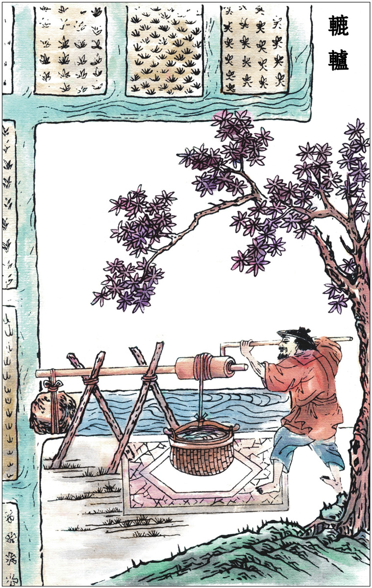 【原文】凡稻防旱借水,独甚五谷。厥土〔1〕沙、泥、硗〔2〕、腻〔3〕,随方〔4〕不一。有三日即干者,有半月后干者。天泽不降,则人力挽水以济。凡河滨有制筒车者,堰陂〔5〕障流,绕于车下,激轮使转,挽水入筒,一一倾于枧〔6〕内,流入亩中。昼夜不息,百亩无忧(不用水时,栓木碍止,使轮不转动)。其湖池不流水,或以牛力转盘,或聚数人踏转。车身长者二丈,短者半之。其内用龙骨〔7〕拴串板,关水逆流而上。大抵一人竟日之力,灌田五亩,而牛则倍之。