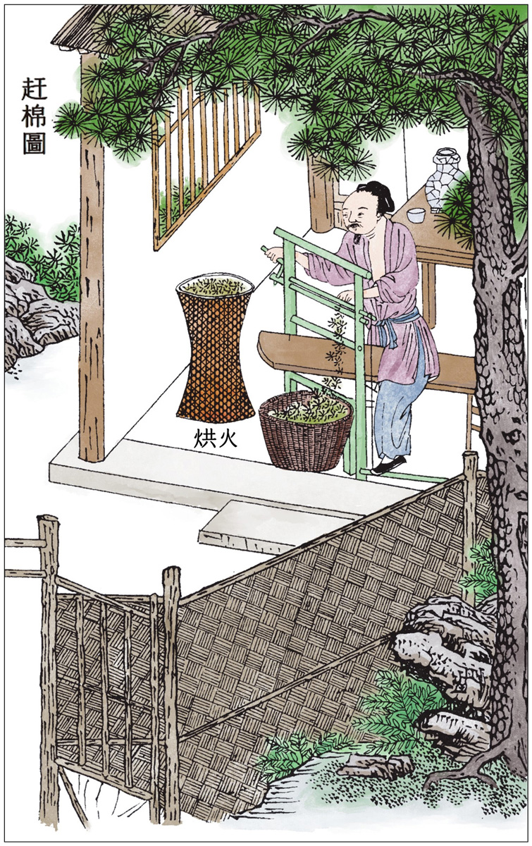 【译文】无论贫富,人们都要用棉花和布抵御风寒。棉花在古书上名叫枲麻,种植非常广泛。棉花有木棉和草棉两种,花有白和紫两种颜色。各地种植的棉花,白色的占十分之九,紫色的占十分之一。春天种棉花,秋天结棉桃。棉花的采摘不是在同一时间进行的,先绽开的棉桃要先采摘。棉花的籽同棉絮粘在一起,将棉花放在赶车上分出棉籽。分出棉籽后,再用悬弓弹松(用来做棉被和棉衣的棉絮,加工到此为止)。弹松的棉花用木板搓成长条,再用纺车纺成棉纱,然后绕在大关车上,就可以牵经织布。技术高超的纺纱工一只手能握住三个纺锤,将三根棉纱纺在锭子上(速度虽然快但棉纱不紧实)
