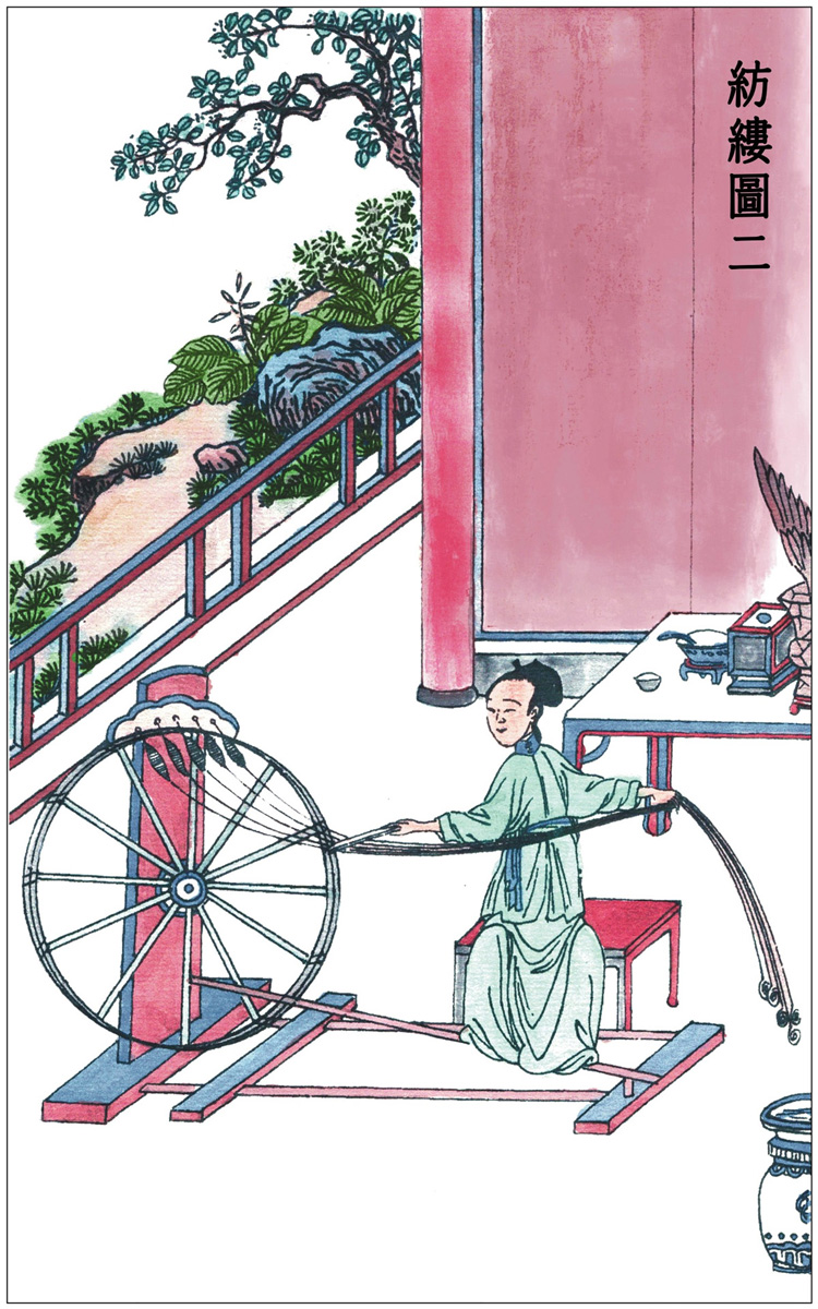 凡织绒褐机大于布机,用综八扇,穿经度缕,下施四踏轮,踏起经隔二抛纬〔7〕,故织出纹成斜现。其梭长一尺二寸,机织、羊种皆彼时归夷〔8〕传来(名姓再详),故至今织工皆其族类,中国无与也。凡绵羊剪毳,粗者为毡,细者为绒。毡皆煎烧沸汤投于其中搓洗,俟其粘合,以木板定物式,铺绒其上,运轴赶〔9〕成。凡毡绒白、黑为本色,其余皆染色,其氍毹、氆氇等名称,皆华夷各方语所命。若最粗而为毯者,则驽马〔10〕诸料杂错而成,非专取料于羊也。