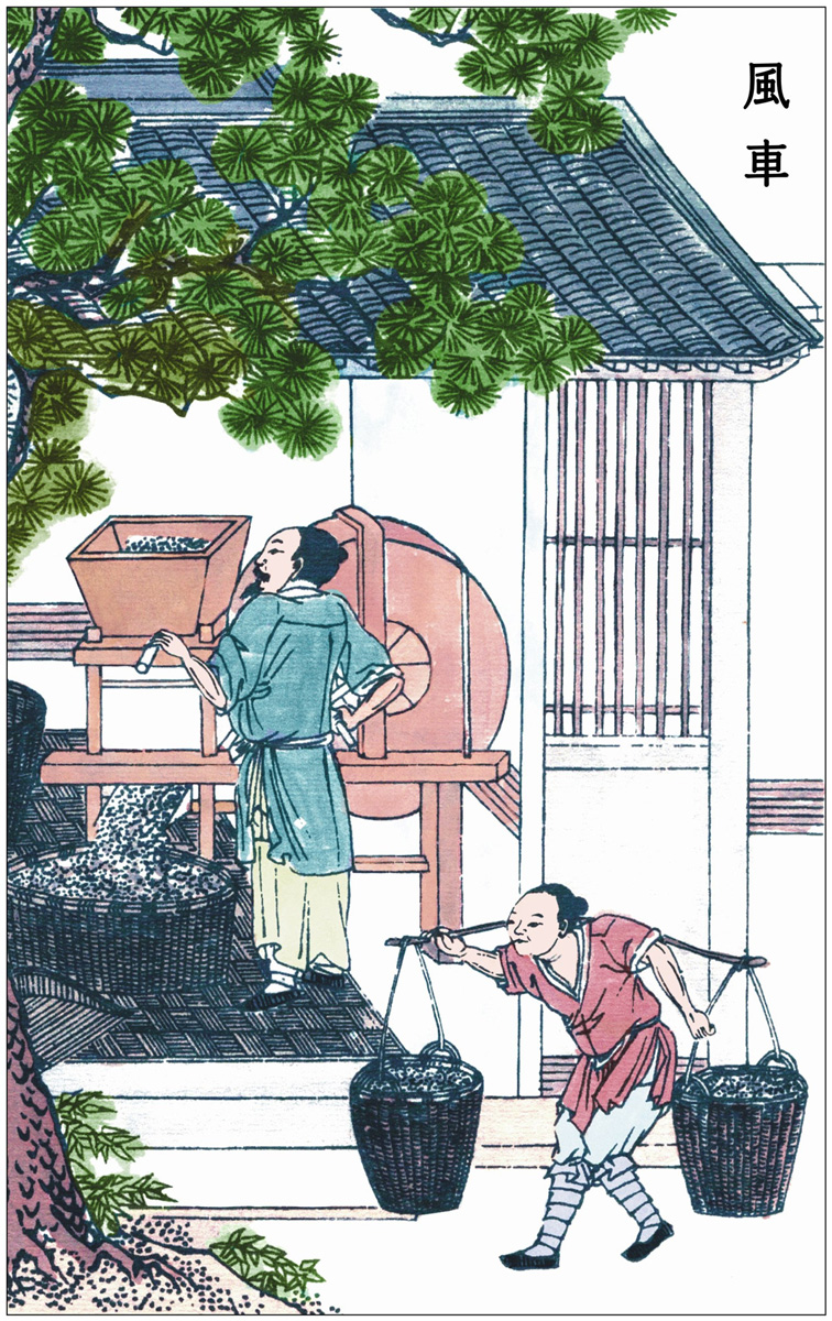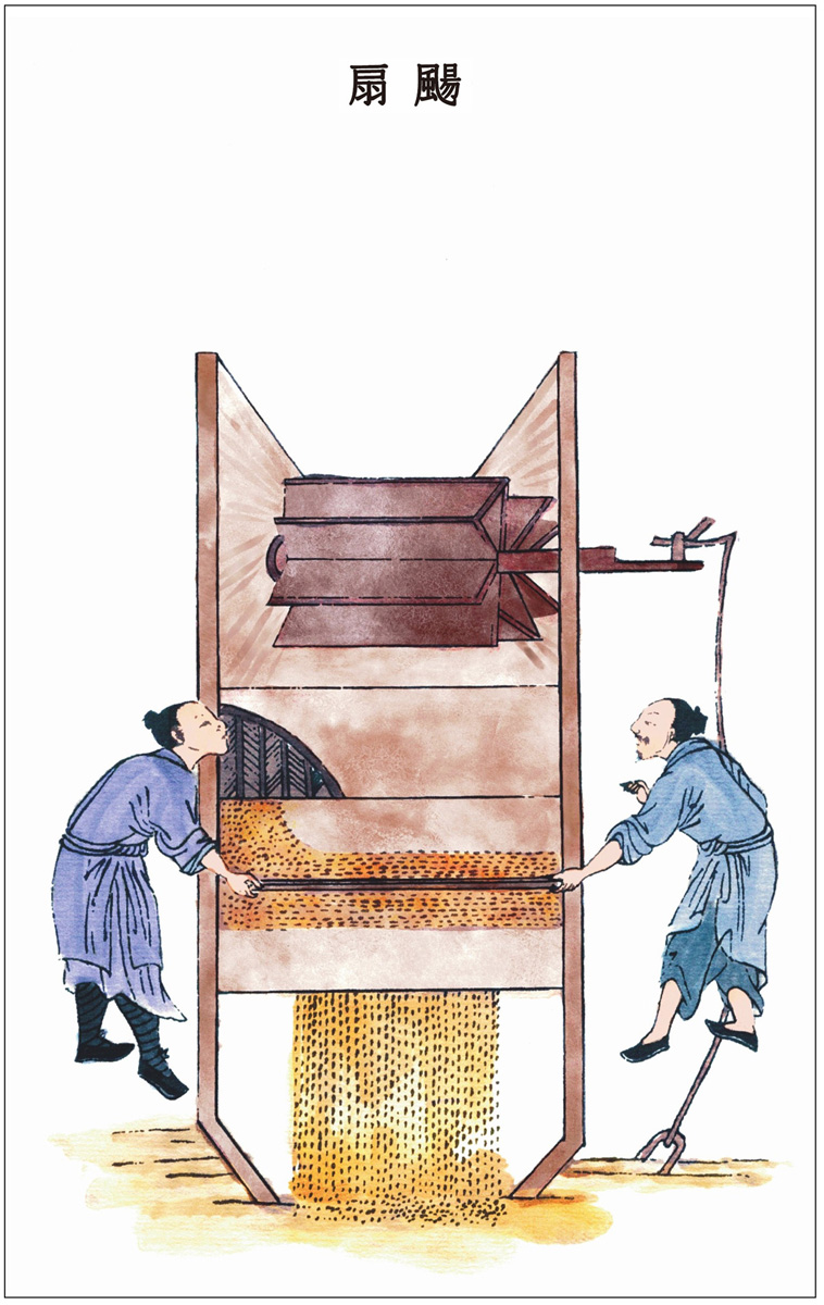 凡稻最佳者九穰〔6〕一秕〔7〕,倘风雨不时,耘耔〔8〕失节,则六穰四秕者容有之。凡去秕,南方尽用风车扇去。北方稻少,用扬法,即以扬麦、黍者扬稻,盖不若风车之便也。