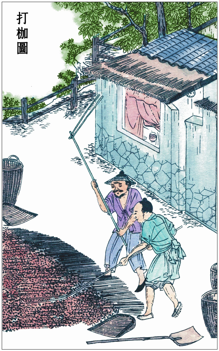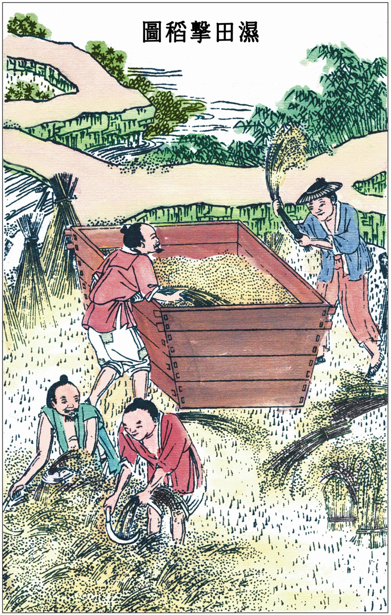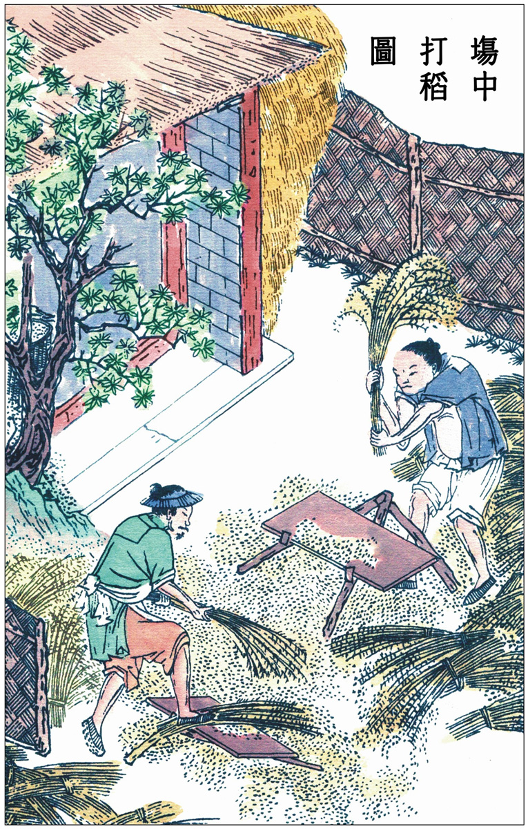 【原文】凡稻刈获〔1〕之后,离稿〔2〕取粒。束稿于手而击取者半,聚稿于场而曳牛滚石以取者半。凡束手而击者,受击之物或用木桶,或用石板。收获之时雨多霁〔3〕少,田稻交湿不可登场者,以木桶就田击取。晴霁稻干,则用石板甚便也。
